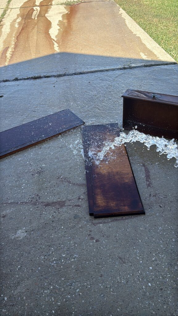 Youโll see the old finish begin to lift away …itโs oddly satisfying! Dip your brush often and keep the surface damp so youโre really getting into the grain. The more you scrub, the more that dark cherry stain comes off, revealing the natural wood underneath. Lastly you want to spray off all the scrubbed off stain with the water hose.