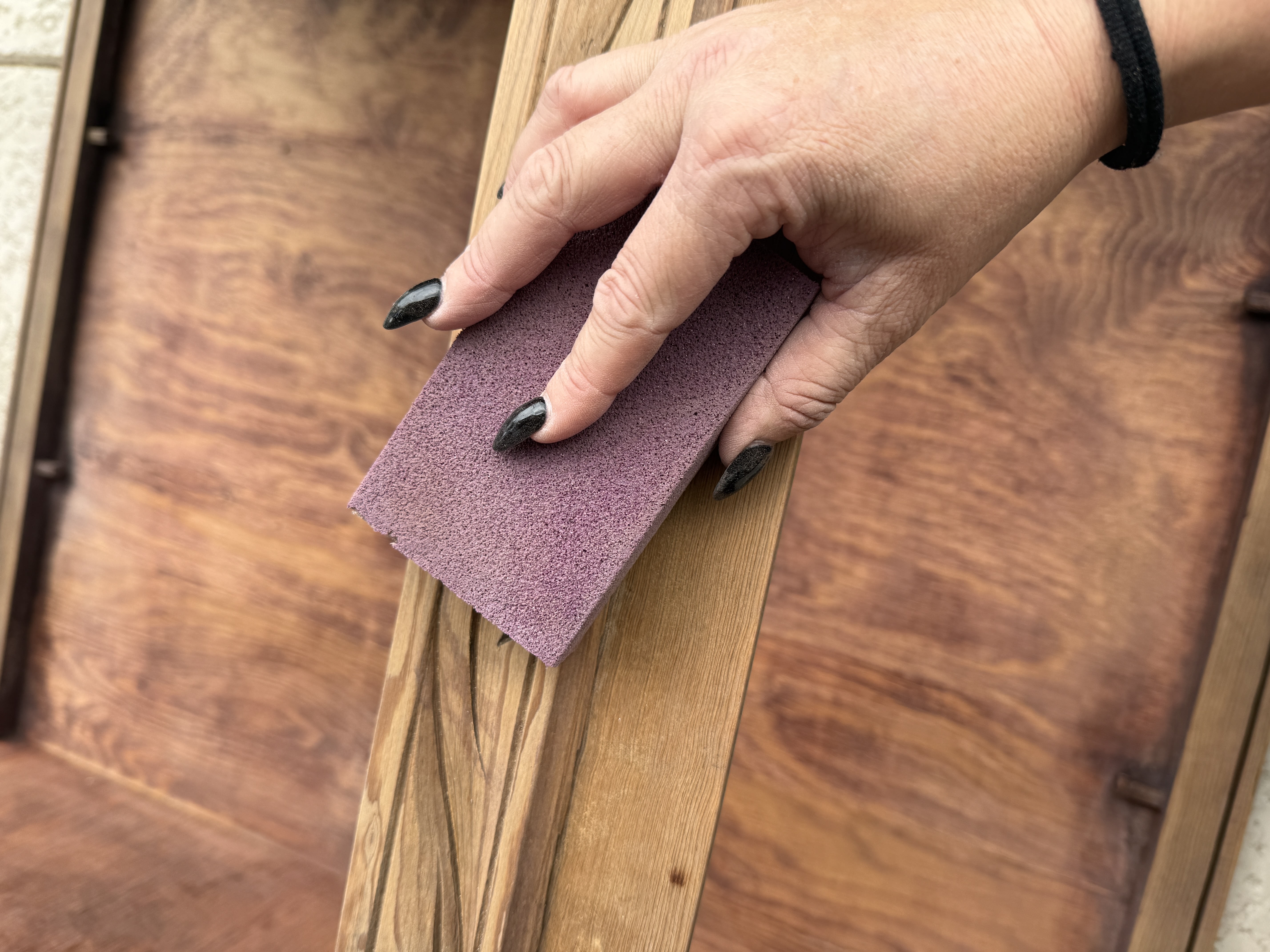 DO NOT- start this step until you have your piece stripped. So I repeated Steps 1-5 – 3 times before sanding. Once you have your desired tone for piece you want to make sure everything was dry, I took a Gator Medium Sanding Sponge and lightly buffed the entire surface. This isnโt to remove more color โ just to smooth out the grain and edges.