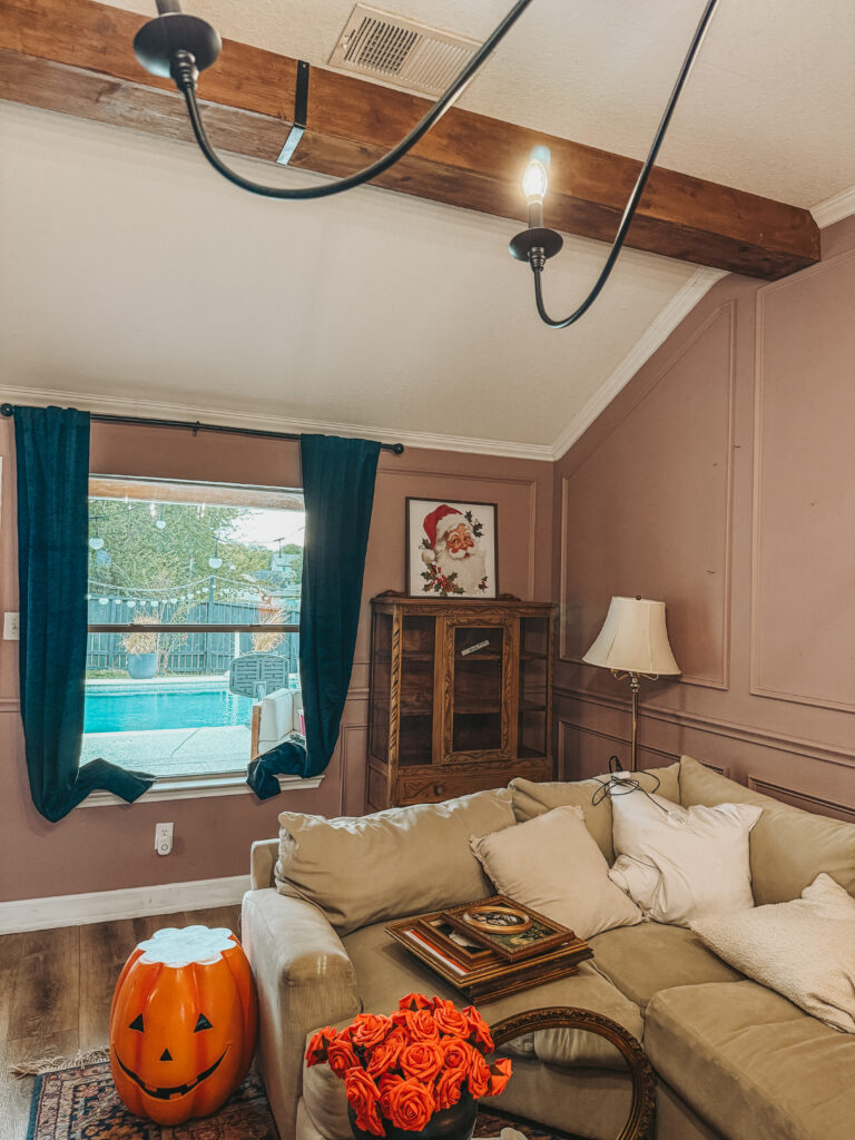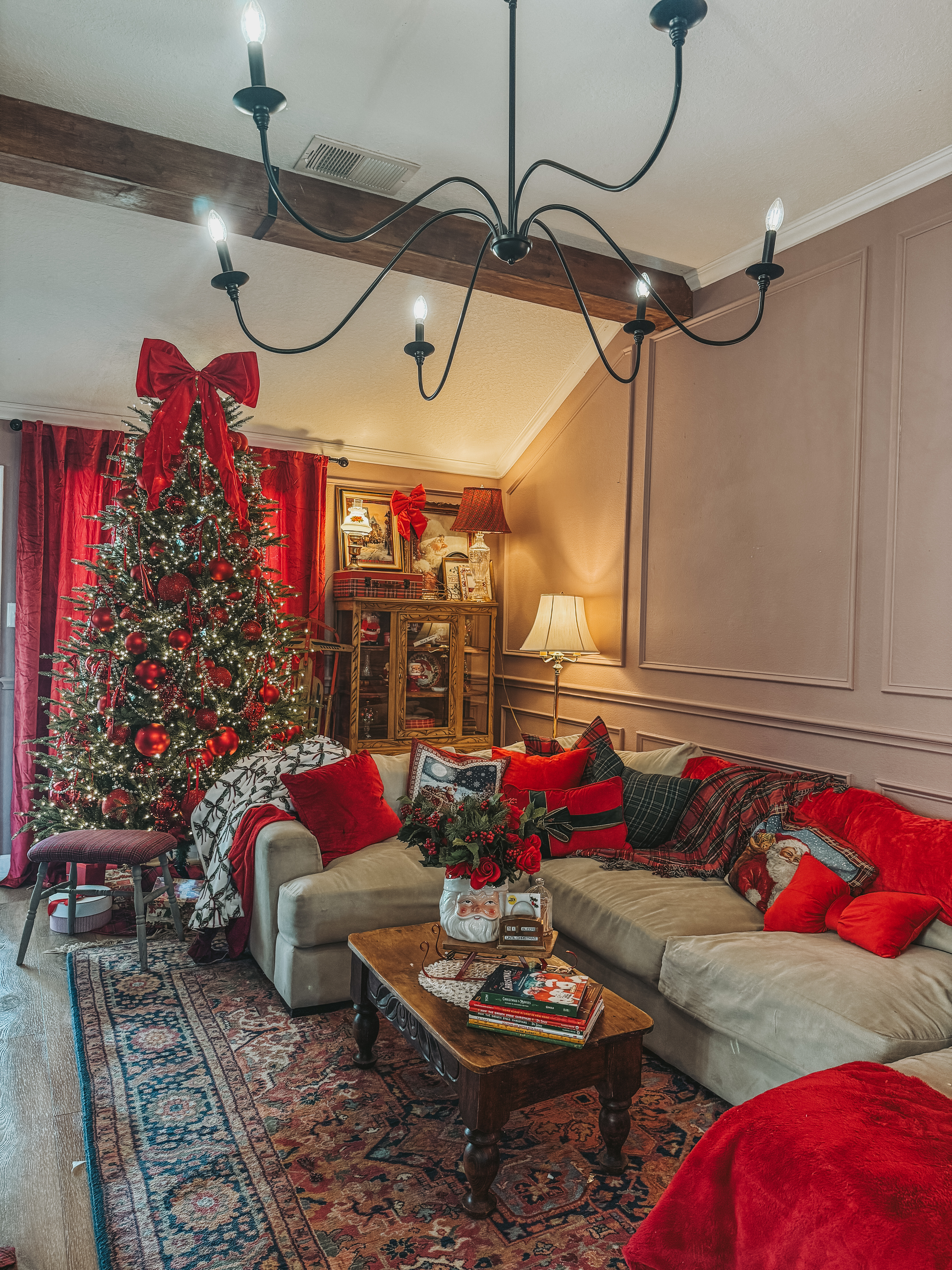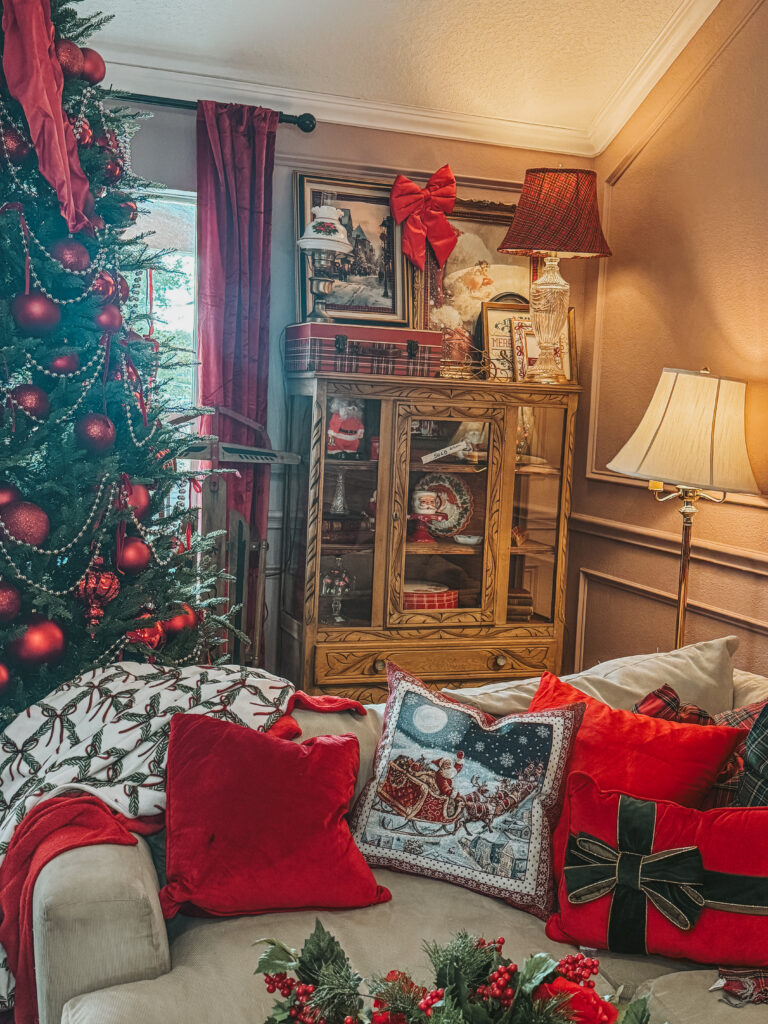 Between the layered lamps, the warm glow of the Christmas lights, and the cozy plaid pillows, it feels like a Hallmark movie set in real life.