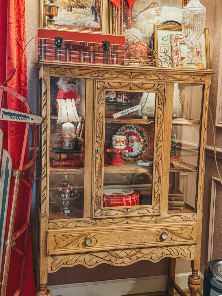 Inside the glass doors, I added a mix of vintage Santa mugs, plaid boxes, and thrifted dรฉcor that ties everything together. On top, I layered artwork with a nostalgic winter village scene, a red plaid suitcase, and a big red bow โ the cherry (or should I say not-so-cherry-wood) on top!