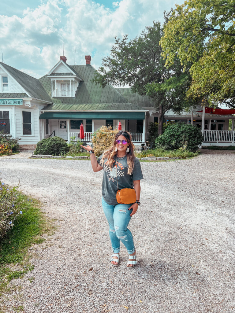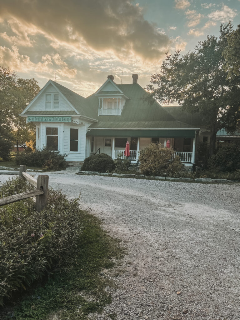 What it is: A railroad-era resort (opened 1901, restored 1990s) on the banks of the Colorado River/Lake LBJ. The property includes the vintage hotel, cottages, three brightly painted cabooses converted into adorable family stays, and — this is the key for Chainsaw fans — the 1974 house sits right next door as the on-site restaurant. We booked a caboose for the full “sleep steps from horror history, but make it cozy” experience.