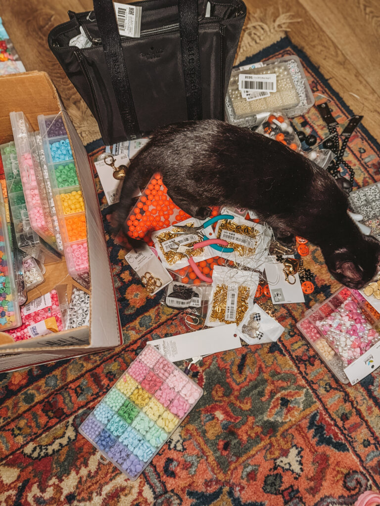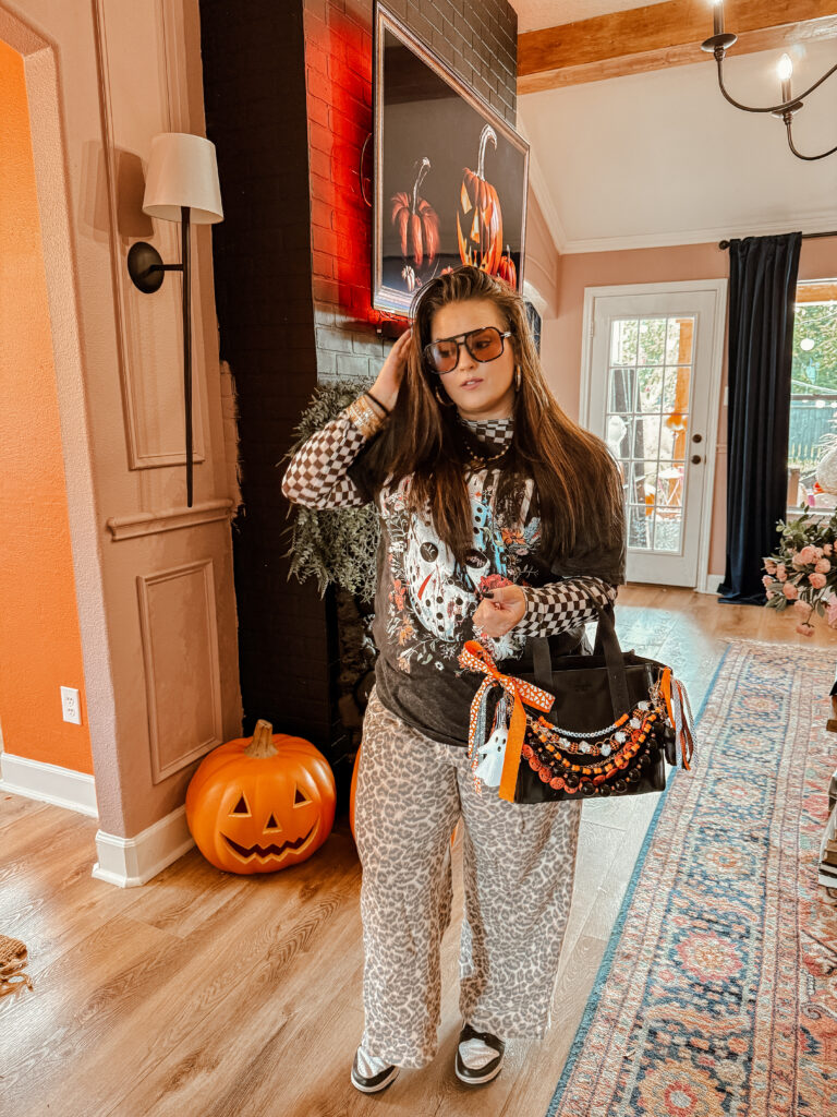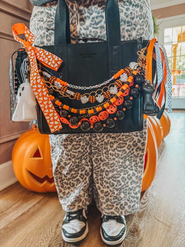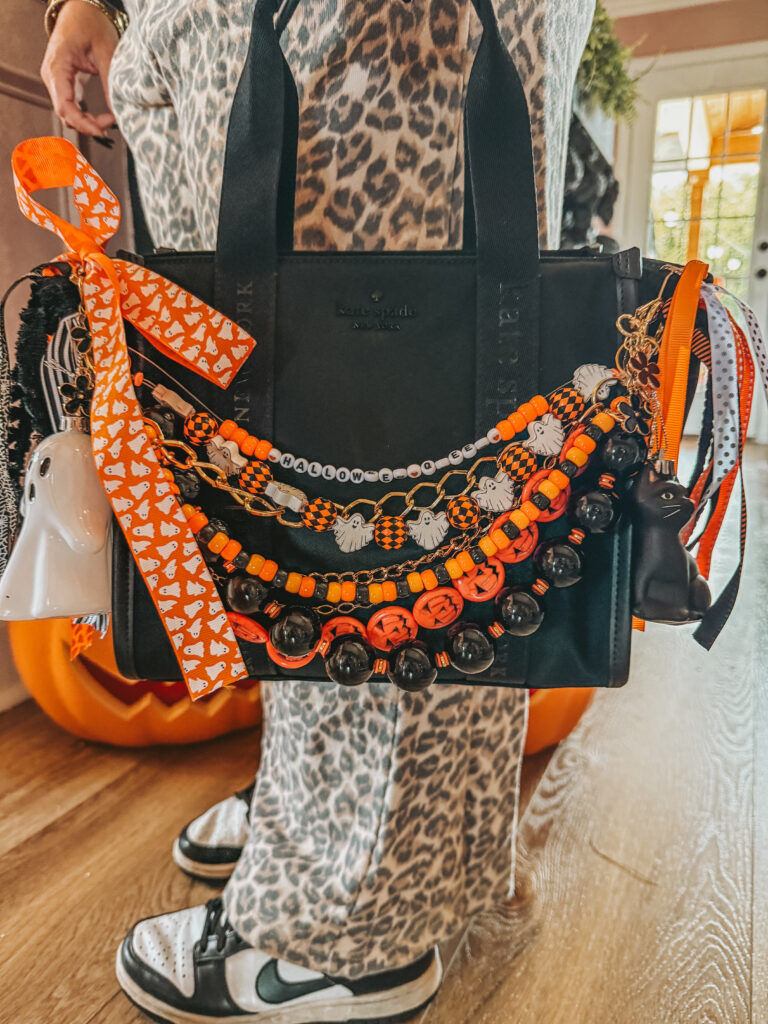 I wanted something that looked designer-inspired, custom, and just over-the-top fun. Iโve always loved charm jewelry and bag flair, so combining that with spooky season? Instant YES.