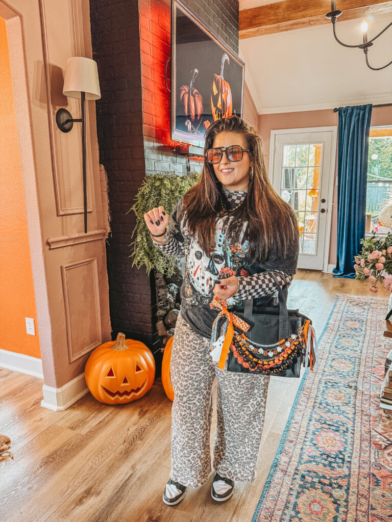 Whether youโre running errands, headed to a pumpkin patch, or just want your outfit to scream โOctober is HERE,โ this DIY bag charm is everything. Just look at that spooky glam: