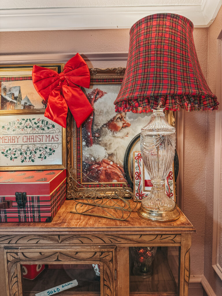5. Styled it on top of my $20 raw-wood thrifted cabinet with Santa art, tartan accents, and a Christmas tree sparkling beside it