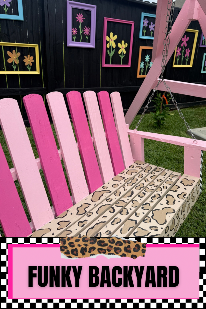 vibrant, "funky" aesthetic featuring a bright pink, cheetah painted swing set, a black and white checkered accent wall, and colorful floral artwork hanging on the fence.