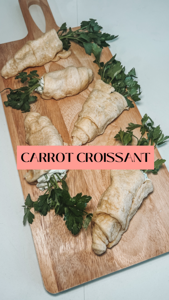 A little tip for this recipe…. When creating the “carrots” you have 2 options for bread. You can use the pre-made crescent rolls or you could buy the dough sheet. If you use the dough sheet, you will roll it out and use a pizza cutter to create long strips. I will tell you the first time I made this I went with the pre-made croissant rolls but next time I will use the dough sheet. I feel like with the dough sheet I could have more control with the shape when making the the carrots. The pre-made crescent rolls were hard to work with and I don’t think they look as realistic.